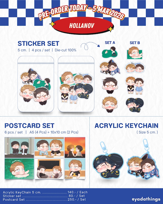 ลักษณะสินค้า: Sticker Set Die-cut 100% | Postcard Set A5 + 10×10 cm. | Acrylic KeyChain 5 cm.