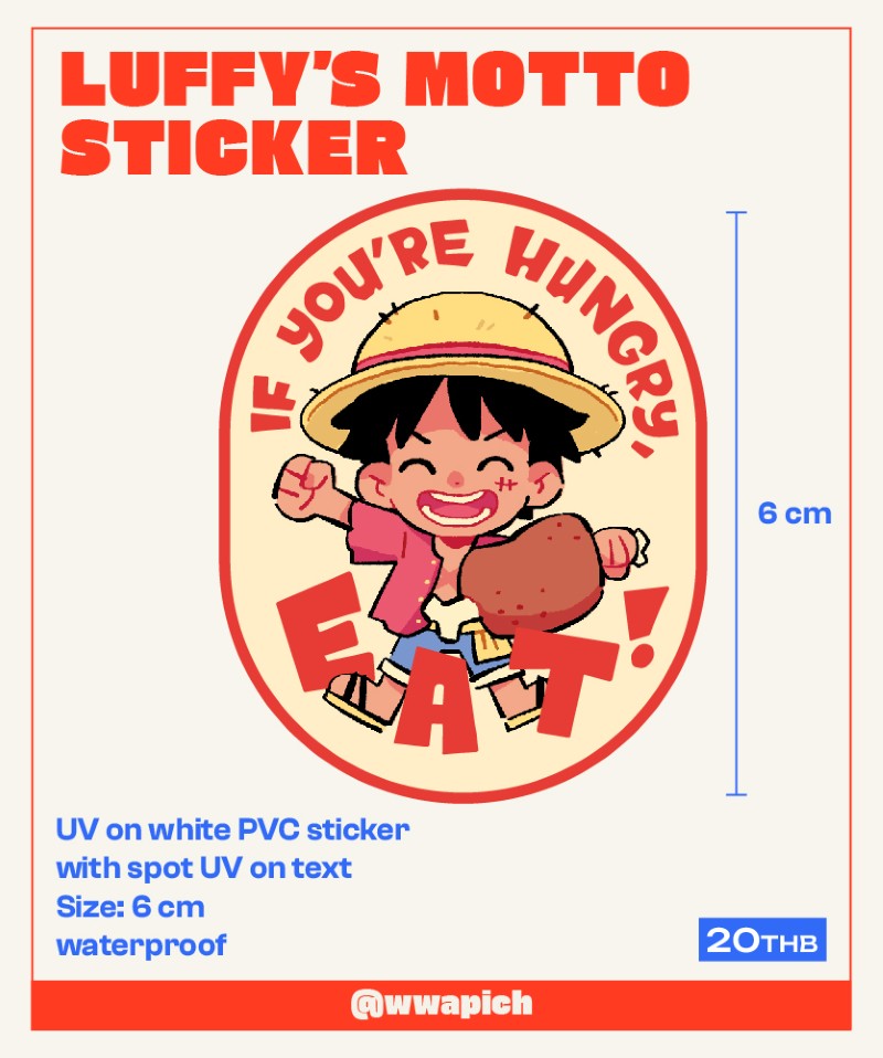 ผู้จัดทำ : wapich อ้างอิงจากเรื่อง: One Piece ลักษณะของสินค้า: 100% die-cut /UV-printed on white PVC sticker Size: 6 cm